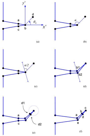 Relaxation of the split nodes is the release of the nodes in accordance with their mechanical properties. When the criterion for crack propagation are satisfied at a particular crack tip, the crack tip node has to be split into two separate nodes so that the crack opening can be simulated. If it is necessary to display the deformation, the displacement should be continually updated using the coordinates of the boundary nodes. The splitting direction is determined by dividing the angle between the segment that initially includes the present crack-tip and the segment that connects the present crack-tip to the predicted next crack-tip, upwards and downwards. Figure 5 shows the node splitting and relaxing procedure. Assuming that a and c are the initial nodes that come before and after the crack tip b, respectively, and that d is the estimated next crack tip. The incrementally crack length will be |bd|, and the trajectory will be as indicated in Figure 5a. As illustrated in Figure 5b, the angle between segments ab and bd is divided and the splitting direction is chosen at as shown in Figure 5c, which involves both upwards and downwards directions. If the length of the splitting is set to , the length of each splitting node b1 and b2 from the original crack tip is as shown in Figure 5d. The new segments connecting the new crack tip to the split nodes should be the same length. If they are not, it will be ridiculous to create the uniform rosette template later. As a result, two additional boundary nodes must be inserted, as seen in Figure 5e. Finally, only a total of three nodes need to be added in every step of the crack growth as shown in Figure 5f, and the geometry can now be updated.
