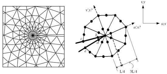 and L denotes the length of the quarter-point element. Where and are the displacement components in the x′ and y′ directions, respectively, as denoted in Figure 5.
