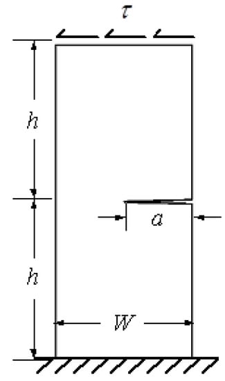 As shown schematically in Figure 7, the growth of an edge crack in a rectangular plate subjected to a shear stress, τ = 1 unit is considered. The initial crack length is a = 3.5 cm, the width of the plate is W = 7 cm, and the height is 2h = 16 cm. The material properties are selected as modulus of elasticity, E = 30 × 106 N/mm2 and the Poisson’s ratio, ν = 0.25. It is assumed that the plane strain condition is applied in this case. Figure 8 displays the initial adaptive mesh as well as the contour distribution of the maximum principal stress and von Mises stress for the first step before crack growth. The highest values of maximum principal stress and von Mises stress are visible at the tip of the crack.