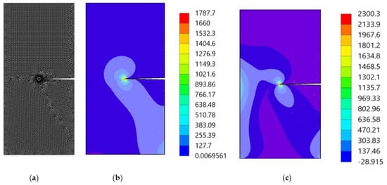 (a) The adaptive mesh, (b) maximum principal stress (MPa), and (c) von Mises stress (MPa).