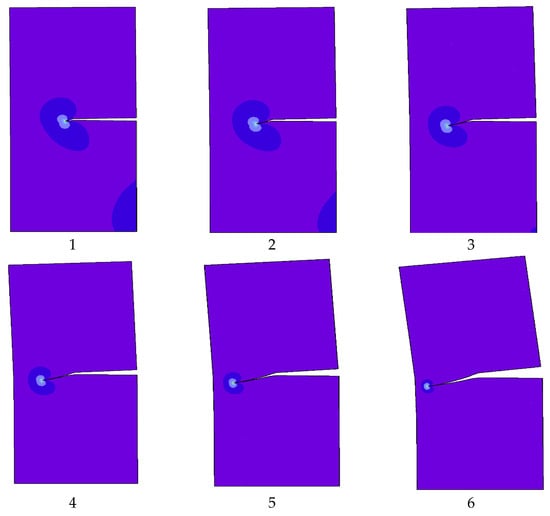 It was found that the estimated crack growth path agreed the experimental path observed by [48]. In addition, the predicted crack propagation direction agrees with the predicted trajectories of other previous numerical [49,50], and [47]. The study in [49] utilizes FEM based on local Lepp–Delaunay meshes refinement, the work [50] uses FEM with configurational forces, and the method in [47] applies coupled extended mesh free–smoothed mesh free method. The results were compared to the finite element results obtained in [27] uses ViDa program as shown in Figure 15a–f, respectively. It is important to observe, in the early stages of the expansion of the crack, that the crack expands in a straight path. That is because the crack tip is still relatively distant from the hole. However, since the hole influences the direction in which the crack grows, the direction in which the crack propagates changes at a significant angle and progressively moves closer to the hole. Figure 16 depicts the von Mises stress, together with an enlarged view of the region around the crack tip. Figure 17 illustrates the distribution of the maximum principal stress distribution, with an enlarged view of the region around the crack tip.