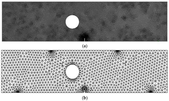 Adaptive mesh for the modified four-point bending beam, (a) dens mesh and (b) coarse mesh.