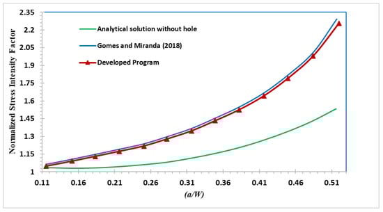 To demonstrate the influence of the presence of a hole on the crack propagation direction, which is correlated to the associated SIFs, the predicted values of the normalized SIF were compared to the calculated values from the analytical solution represented in Equation (17). Additionally, the dimensionless SIF values were calculated by [27] using the boundary element method (BEM) with BemCracker2D (BC2D) program, as depicted in Figure 18. It was noticed that the hole’s insertion significantly influences the normalized stress intensity factor values.