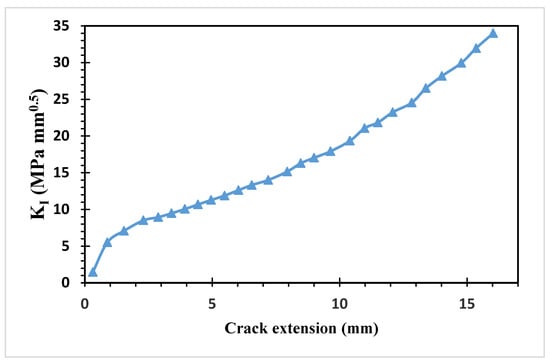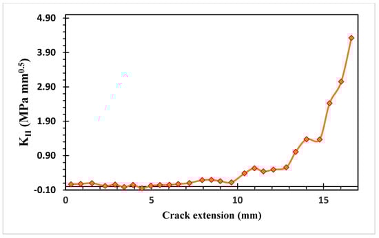 Figure 19 and Figure 20 show the estimated values of both modes of SIFs. At the beginning of the crack’s propagation, KI dominated the crack’s direction because KII values were smaller than to KI values. KII was then steadily raised to a maximum value of 4.323 MPa(mm)1/2 as the second mode of stress intensity factors, resulting in a change in the trajectory of the crack to grow toward the hole.