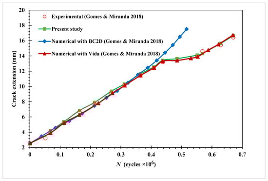 As shown in Figure 21, the calculated fatigue life cycles are compared to the experimental data obtained by [27], and the numerical results obtained by the same authors using two different software: Vida and BemCracker2D (BC2D). While ViDa and BemCracker2D are two-dimensional crack growth programs based on the finite element method and the dual boundary element method. In contrast to the BemCracker2D findings, which deviated from the experimental data in the last stages of crack growth, this figure shows that the present study’s results were in line with both the experimental data and the numerical results produced by Vida 98 software.