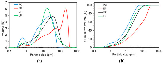 Volume distribution (a) and cumulative distribution (b) of particle size of EP, QP, LP and cement.