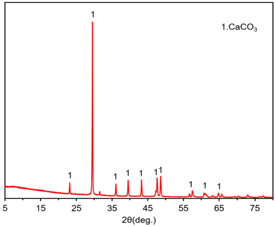 Figure 5 shows the XRD pattern of EP. It can be seen that the phases corresponding to the diffraction peaks of EP are all CaCO3, which is similar to the XRD pattern of limestone [44,45]. This indicates that the main component of EP is the same as that of LP.
