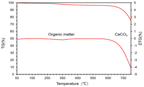 As shown in Figure 6, the thermal decomposition diagram of EP was obtained by TGA–DTG analysis. It can be seen that a slight weight loss exists between 250 °C and 400 °C, corresponding to the decomposition of organic matter in EP. Calculated from the TGA–DTG results, the organic content in EP is about 3%. The continuous severe weight loss after 600 °C is the weight loss caused by the decomposition of a large amount of CaCO3 contained in EP.