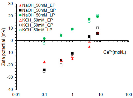 Zeta potentials of EP, QP and LP with Ca2+ concentration in 50 mmol/L NaOH and KOH solutions.