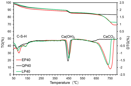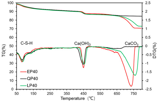 Figure 14 and Figure 15 show the TGA–DTG analysis results of EP40, QP40 and LP40 after 7 and 28 d of hydration. The first weight loss was recorded at 50 °C to 150 °C, which was attributed to the dehydration and evaporation of water in C–S–H. The second obvious weight loss occurred between 410 °C and 490 °C due to the decomposition of Ca(OH)2. In the range of 650–800 °C, the weight loss of EP40 and LP40 is obvious, which is caused by the CaCO3 contained in EP and LP.