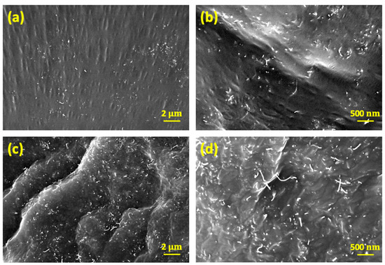 SEM images of composites (a) CNT/PDMS 1 wt% at low resolution, (b) CNT/PDMS 1 wt% at high resolution, (c) CNT/PDMS 5 wt% at low resolution, and (d) CNT/PDMS 5 wt% at high resolution.