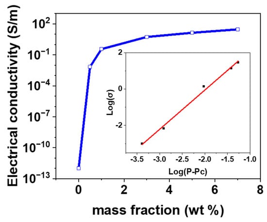 The electrical conductivity and percolation threshold were investigated to confirm the electrical properties of the CNT/PDMS composites in a pressure field. Figure 2 shows the electrical conductivity and percolation threshold according to the filler content of the CNT/PDMS composites. Furthermore, the data of 0.4, 1, 3, 5, and 7 wt% are shown in order. Here, 0.4 wt%, where the initial conductivity was taken, was indicated to find the percolation threshold. In addition, the electrical conductivity was saturated from 5 wt%. Therefore, data exceeding 7 wt% were not displayed. The electrical conductivity of the composite was calculated using Equation (1).