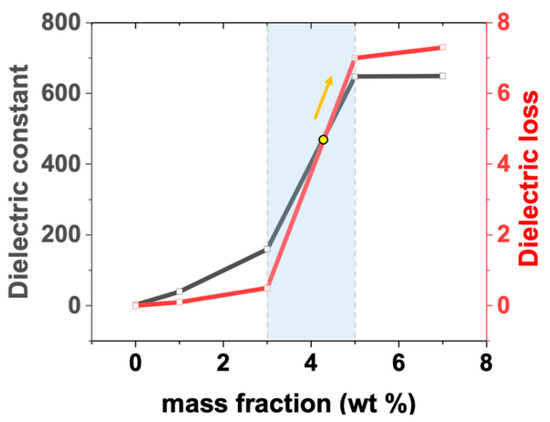 where εr PDMS is the dielectric constant of PDMS, fc is the percolation threshold, fCNT is the filler content, and S is the critical index. According to Equation (4), εr is directly proportional to the CNT filler mass fraction (fCNT). Therefore, the rate of increase in εr is accelerated when the fCNT approaches fc of the CNT/PDMS composite. The trend of the mass-dependent dielectric constant curve of the CNT/PDMS composite in Figure 3 agrees with the percolation theory.
