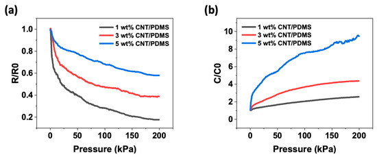 where S is the sensitivity, ∆C is the change in the capacitance, C0 is the initial capacitance when no pressure is applied, and ∆P is the same as that in Equation (5). Figure 4 shows the change in relative resistance (R/R0) (Figure 4a) and relative capacitance (C/C0) (Figure 4b) as a function of pressure for various CNT mass fractions.