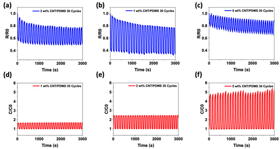 Normalized change in (a–c) resistance (R/R0) and (d–f) capacitance (C/C0) under cyclic pressure deformation at 50 kPa with varying contents of CNTs in the composites: (a,d) 1 wt%, (b,e) 3 wt%, and (c,f) 5 wt% CNT/PDMS.