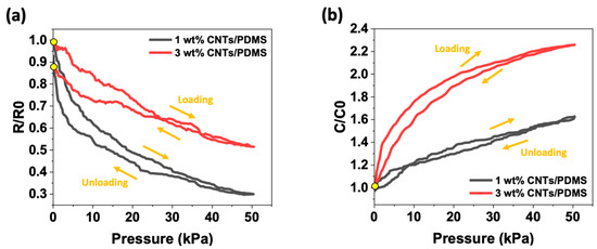 As the content increased, a difference in the rate of change of resistance and capacitance according to the pressure was observed. As shown in Figure 5a, the resistivity of the 3 wt% CNT/PDMS composite was 12%, which is 10% higher than that of the 1 wt% CNT/PDMS composite. Furthermore, as shown in Figure 5b, the capacitance of the 3 wt% CNT/PDMS composite was 2% and the capacitance of the 1 wt% CNT/PDMS composite increased by 4%. Regardless of the operating principle, the hysteresis increased with increasing CNT content. This was caused by impeding the movement of more flexible polymer chains because of the more complex and interconnected fillers in the polymer [52,53]. These results indicate that a higher filler content produces greater mechanical hysteresis and that there is a correlation between the filler content and the hysteresis behavior of these nanocomposites.
