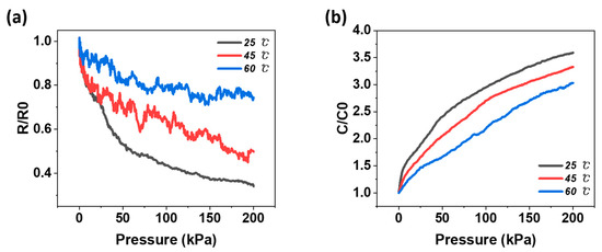 Change in (a) resistance (R/R0) and (b) capacitance (C/C0) versus pressure for 3 wt% CNT/PDMS for the reference group (25 °C, 45 °C, and 60 °C).