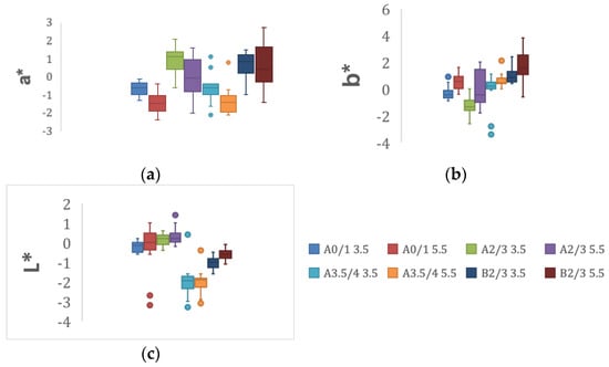 Means and standard deviations of the CIE76 and CIEDE2000 color difference of all groups are presented in Table 4. Box plots of the minimum, maximum, interquartile range, medians and the outliers for each of the L*, a* and b* variables are presented in Figure 3a–c.