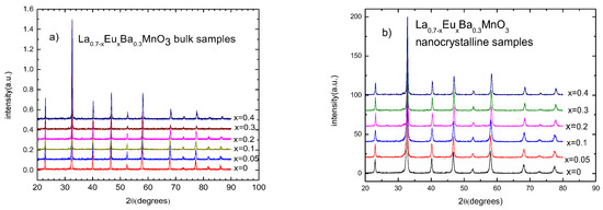 The nano-sized samples were prepared with the sol-gel method. Nitrates of La (99.9%), Eu (99.9%), Ba (99%), and Mn (98%) from Alfa Aesar were used as precursors. They were dissolved in pure water at 60 °C for 45–60 min, after which 10 g of sucrose of 99% purity was added. The mixture was stirred for another 45 min to allow for positive ions to attach to the sucrose chain. The temperature was then reduced and pectin was added 20 min before the end of mixing in order to expand the xero-gel. The mixture was dried in a sand bath for 24 h and then placed in a high-air flow oven at 1000 °C for 2 h.