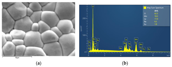 Energy dispersive X-ray spectroscopy (EDX) was also carried out for the bulk samples. As seen in Figure 4b, where a typical example is presented, the stoichiometry of heavy elements (including lanthanum, europium, barium, and manganese) is in very good agreement with the theoretical values. The distribution of the elements on the surface is considerably uniform. It is good to note here that oxygen is a much smaller atom and does not interact with X-rays nor heavier atoms [17] (pp. 279–307). For that reason, iodometry was implemented as a reliable way to calculate oxygen content.