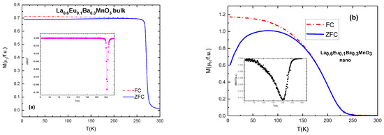 Nano-scale particles also show ferromagnetic behavior, but their TC values are lower compared to the equivalent bulk material, as shown in Figure 6. This is due to the size of particles and their ”surface effects” which occur as a result of a large surface-to-volume ratio [30], i.e., disorder effects in the surface layer of the particles which contain an increased number of broken chemical bond and other defects, resulting in spin canting and reducing the magnetic moment of the particles [31]. An average difference in TC values is 70–90 K for the samples with the same substitution level: TC (x = 0.1 bulk) = 270 K and TC (x = 0.1 nano) = 200 K. It is also interesting that the slope of the magnetization change of the M(T) curves in nanoparticles is much lower than in bulk, which can be attributed to the distribution of the particle sizes within the samples. In general, bulk material has higher values of magnetization and a narrower temperature range of the magnetic phase transition, as can be seen in Figure 6.