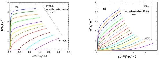 Arrott plots (M2 vs. H/M) allow the determination of the magnetic phase transition order [32]. According to the Banerjee criterion, positive and negative slopes of the curves correspond to second- and first-order magnetic phase transitions, respectively [28]. All of the samples exhibit positive slopes for these curves, indicating second-order magnetic phase transitions. A selected sample of Arrott plots are presented in Figure 7.