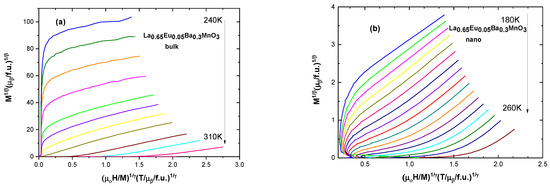 Usually, the 3D Heisenberg model can describe the critical properties of the short-range interactions in doped manganites, together with other theoretical models, such as the mean field and tricritical mean field models. The critical exponent values are related to the range of exchange interaction J(r), spin, and system dimensionality. Within renormalization group theory [37], J(r) = 1/rd+σ (d—dimensionality of the system; σ—range of interaction). For σ greater than 2, the 3D Heisenberg model is valid. For σ < 3/2, the mean field theory of long-range interaction is valid. For an intermediate range, a different universality class occurs. For the tricritical point, the critical exponents are universal: β = 0.25, γ = 1, and δ = 5. The tricritical point sets a boundary between two different ranges of order phase transitions. In this study, we focused on the general different magnetic properties of nano- and bulk polycrystalline manganites, not on their high-detail magnetic critical behavior. The modified Arrott plot (MAP) method is very accurate, and its agreement with the Kouvel–Fisher (KF) method and critical isotherm (CI) plots is usually quite remarkable [24,38]; indeed, some authors only analyze these data [39]. This is why we report here the results obtained by using MAP analysis.