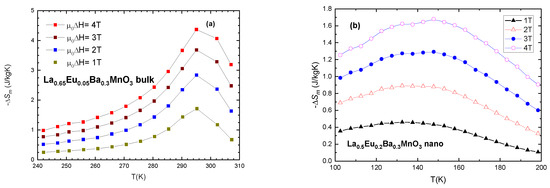 All of the samples exhibit a very small coercive field as evident from hysteresis curves, with the largest values of 170 Oe for x = 0.05 bulk and 960 Oe for x = 0.4 nano-sample. This can be largely attributed to low anisotropy and lack of pinning sites [40]. Nanoparticles show greater coercivity than their bulk counterparts, as shown in Table 6 and Table 7. It has been found, in previous works, that nanoparticle coercivity tends to increase with a decreasing size in the multi-domain range, and then it decreases in the single-domain range until it reaches a superparamagnetic state, when it becomes zero [41]. Low coercivity is of utmost importance for the magnetocaloric effect.