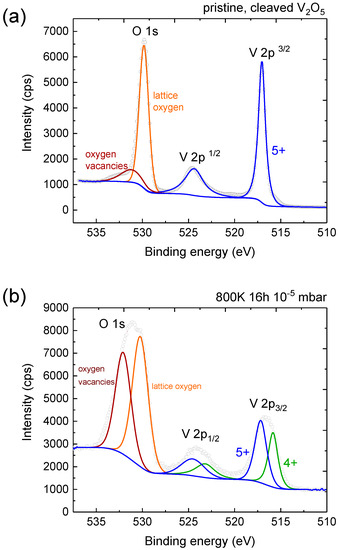 XPS measurements of the pristine and annealed crystal are depicted in Figure 4. The V 2p region of the pristine crystal only contains a 5+ contribution. The O 1s region of the annealed crystal can be deconvoluted into the dominant peak of lattice oxygen and a peak at higher binding energy corresponding to oxygen vacancies created upon annealing, as has been observed in other metal oxides [37]. The V 2p regions display 5+ and 4+ contributions in line with XRD measurements. The energetic positions of oxygen vacancies, lattice oxygen and V 2p components along with the energy difference between lattice oxygen and each V 2p component—in the case of the pristine and annealed crystal—are in agreement with [38,39]. XRD measurements reveal the overall V 2p line shape is due to several phases including V 2 O 5 (5+), VO 2 (4+) and mixed valence V 6 O 13 and V 4 O 9 . Therefore, we cannot estimate the proportion of each phase in the surface region.