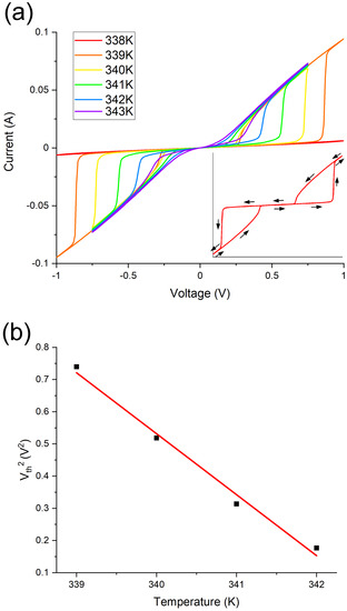 Figure 5. (a) Voltage–current measurements at a range of set temperatures. At the threshold voltage the current sharply increases corresponding to a drop in the resistance. This corresponds to the VO 2 switching to its metallic state. As the set temperature is reduced the threshold voltage increases. (b) plots the square of the threshold voltage against the set temperature. The linearity is evidence for a Joule heating-induced switch.