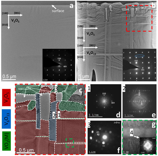 A remarkable structural feature of the annealed sample is the splitting of the initially single crystalline V 2 O 5 phase by narrow extremely defined strips in the direction parallel to the sample surface. A higher magnification HRTEM image from the area, highlighted by the green dashed square in Figure 6c, is shown in Figure 6g. The FFT inset—corresponding to the strip—reveals it consists of VO 2 and an amorphous phase giving rise to the halo in the FFT.