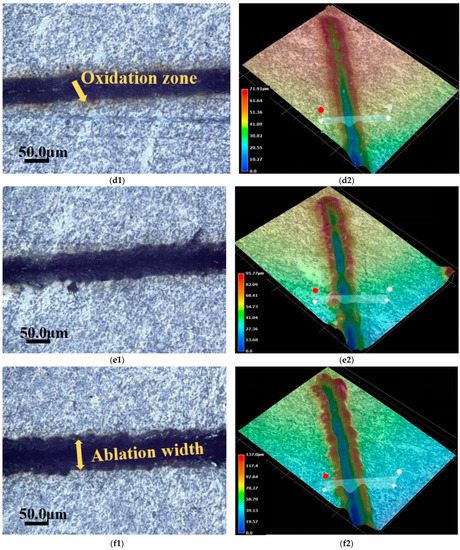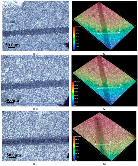 It can be observed from Figure 5 that when the power reaches 5 W, the ablation depth is only 4.131 μm and the ablation width is 26.27 μm. When the power reaches 15 W, the ablation depth is about 14.24 μm and the ablation width is 54.58 μm, corresponding to the real-time depth of the field map. At this time, with the increase in laser power, the roughness of the machining surface decreases, and the machining depth and width are smaller. When the power reaches 20 W, the ablation depth is 18.20 μm and the ablation width is 62.19 μm. When the power is increased to 25 W, the ablation depth is 34.08 μm and the ablation width is 69.86 μm. When it increases to 50 W, the ablation depth is 79.15 μm, and the ablation width is 120.53 μm. At this time, the ablation width and depth have reached the maximum. The trend diagram shown in Figure 5c,d uses the differences in the width and depth values after the power changes.