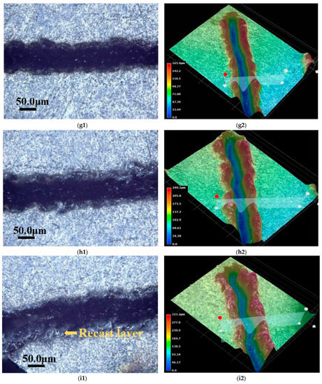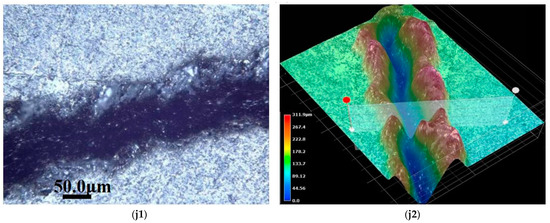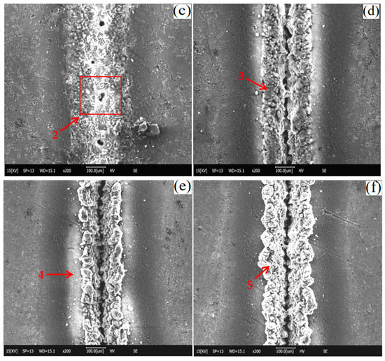 Figure 7e shows the typical observation results of the HAZ region during laser etching of the SiCp/Mg composites. When the power is 5 W~15 W, the state of the heat-affected zone on the surface of SiCp/Mg composites is not very obvious. Since the magnesium alloy with a lower melting point will be melted first and while SiC with a higher melting point is still on the surface of the original composite, silicon carbide particles will appear, as shown in Figure 7(a1). The width of the heat-affected zone in the upper half of the SiCp/Mg composite processing area is between 100 μm and 200 μm. A nanosecond pulsed laser etching device was chosen, so that a more pronounced frequency hole can be observed at the etched area (as shown in Figure 7(c2)) when the power reaches 15 W. Figure 7(d3) indicates that the surface is a smoother etched edge area after the power reaches 20W. At the end of laser etching, the width of the heat-affected zone evidently increases. Figure 7(e4) indicates the most severe example of oxidation of the material close to the etched area. After the power reaches 30 W, the edges of the etched area will start to form a raised hanging slag structure, as shown in Figure 7(f5). Therefore, the width of the heat-affected zone will gradually increase along the laser etching direction. After the power reaches 35 W, the inner wall of the hanging slag will form a more dense arrangement of silicon carbide wrapped by the magnesium alloy, as shown in Figure 7(g6). With the increase of power, the hanging slag will continue to accumulate and eventually fall off at the hanging slag edge, as shown in Figure 7(j7). The width of the heat-affected zone near the end of the laser etching procedure is obviously higher than that of the other regions. This is due to the rapid flow and oxidation of the molten matrix material at high temperature. Heat radiates to both sides of the processing area, and the presence of SiC particles makes the heat transfer speed faster.