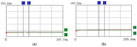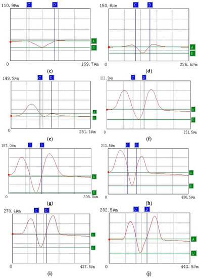 The changes in hanging slag and physical morphology on the surface of the laser-machined SiCp/Mg composites can be preliminarily observed from the real-time depth of the field map. The specific measurement chart below further verifies the surface changes in the laser-processed SiCp/Mg composites under different powers from the numerical simulation curve. A and B are the upper and lower limits of the measured depth, and C and D are the two limits of the measured width. This is shown in Figure 4.