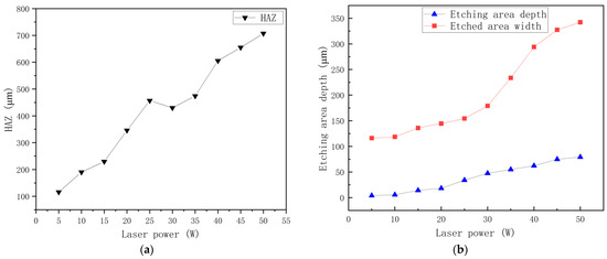 (a) Heat-affected zone trend graph; (b) comparison of etching width and depth variation.