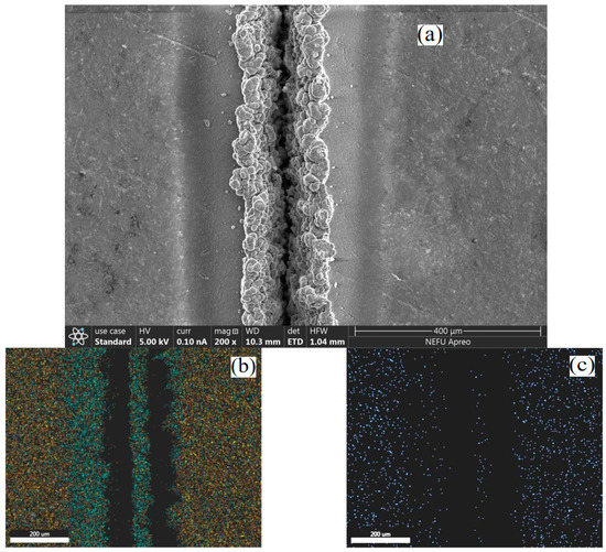 When the laser processing power reaches 20 W, a large number of visible SiC particles are splashed out in the ablation process, as shown in Figure 9a. This is because the AZ91 matrix cannot combine with unmelted silicon carbide particles in the post-melting period. The silicon carbide particles are spattered out under the action of high-pressure gas and adhere to the master plate. At this time, the width of the complete rebinding zone and the incomplete binding zone around the etching region are 49.07 μm and 95.16 μm, and the width of the pure thermal shadow region is 107.53 μm. It can be observed using the scanning electron microscope that the probability of silicon carbide particles being spattered out in the ablation process increases under the laser processing power of 25 W. The width of the complete mixing zone is 154 μm, the width of the incomplete mixing zone is 265.93 μm, and the width of the partial fusion zone is 436.59 μm. The results show that when the power reaches 20 W, the silicon carbide particles will be splashed out of the processing area and will bind to the surrounding magnesium alloy matrix. This will affect the surface properties of SiCp/Mg composites and the heat transfer process.