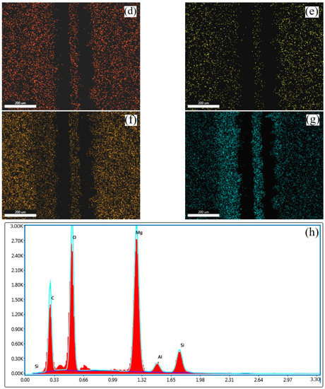 Figure 8a,h show the elemental distribution of the EDS surface map analysis. The scan results show that the laser-etched SiC/Mg composites have a high content of Mg and O elements around the etched area, and many C and Si elements. This indicates that after laser processing, MgO and SiC particles accumulate on both sides of the etching zone. The distribution of oxygen elements can distinguish the distribution of the heat-affected zone and each area of SiC and AZ91D during laser etching of SiC/Mg composites.