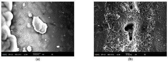 As shown in Figure 10a,b, the silicon carbide particles bond to the AZ91D substrate under high power. In Figure 10a, it can be observed that a bonding region between the magnesium alloy substrate and the silicon carbide has been formed. In Figure 10b, the transition region between the recombined organization of silicon carbide and the magnesium alloy matrix and the original surface can be observed.