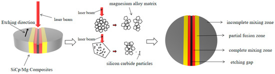 At present, the problem of precision and efficient machining of SiCp/Mg composites urgently needs to be solved. Laser processing can solve these problems, but research on laser processing of SiCp/Mg composites is still required. Therefore, this paper uses a low-power nanosecond pulse laser etching experiment and mechanism research on SiCp/Mg composite materials to solve the industry demand. At the same time, scanning electron microscopy (SEM) and ultra-depth of field (DOF) microscopy were used to observe and analyze the morphology and microstructure of the etched region under different machining powers. The effect of power on the laser etching effect of SiCp/Mg composites was studied. The results provide a theoretical basis for laser etching and laser cutting of SiCp/Mg composites [19,20].