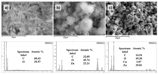 SEM micrographs revealed by: (a) MC, (b) ZnO/MC and (c) Cu (1 at.%):ZnO/MC samples, together with their corresponding EDX spectra.