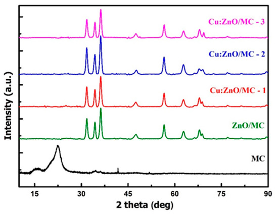 XRD patterns recorded for MC, ZnO/MC, Cu (0.1%):ZnO/MC, Cu (0.5%):ZnO/MC and Cu (1%):ZnO/MC samples.