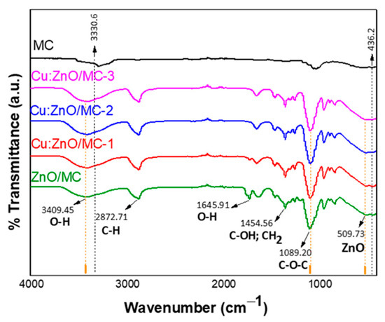 The wide peak at 3409 cm−1 and the one from 1645 cm−1 correspond to bending vibrations of the surface O-H groups, the latter being specific to adsorbed water [52]. The splitting of the last band was observed for all the samples, including Cu:ZnO NPs, and the intensity of the resulting bands increased with the Cu-doping up to 1 at.%. This confirms the increased amount of adsorbed water and water-cellulose interaction when their size decreases (Figure 1c). At the same time, the higher intensities of 3409 cm−1 for ZnO/MC and Cu:ZnO/MC samples, when compared with the peak of pure cellulose (3350 cm−1), clearly indicates the presence of direct interactions between these nanoparticles and the surface OH groups of cellulose. Peaks at 2872 and 1367 cm−1 are assigned to the stretching and bending vibrations of C-H, while the CH2 bending vibration of the pyranose ring of glucose can be observed at 1454 cm−1. The most intense and sharp peak from 1089 cm−1 with a shoulder at 1050 cm−1 is attributed to C-O-C vibrational pyranose ring of cellulose [53,54]. The presence of Zn-O vibration around 509 cm−1 (Figure 4) indicates the existence of ZnO [55]. For ZnO covered with cellulose, peaks at ~420 and 510 cm−1 were reported [56]. The peak at 509 cm−1 overlaps with the cellulose peak at ~550 cm−1 [53]. As detailed in the Section 3. Results (Figure 4) and according to Table S2 (see Supplementary), peaks at different frequencies and shifts of the absorption bands from the FTIR spectra can be observed for the samples containing ZnO/MC, Cu (0.1%):ZnO/MC, Cu (0.5%):ZnO/MC and Cu (1%):ZnO/MC samples, compared with the MC (microcellulose) sample, confirming the presence of ZnO and its effective interaction with MC molecules.