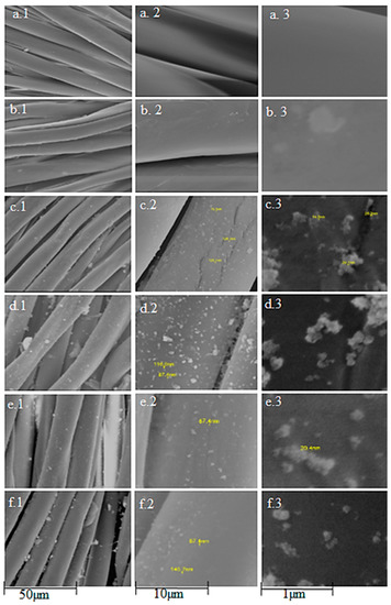 SEM micrographs of the polyester/cotton mixture (50%/50%): untreated (a.1–a.3) and coated with MC (b.1–b.3), ZnO/MC (c.1–c.3), Cu (0.1%):ZnO/MC (d.1–d.3), Cu (0.5%):ZnO/MC (e.1–e.3), Cu (1%):ZnO/MC (f.1–f.3), recorded at different magnifications.