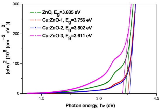 Analyzing the photocatalytic behavior of simple oxide NPs obtained by (co)precipitation, firstly, a consistently better activity regarding the degradation of MB (Figure 6a) compared with that for MO (Figure 6b) is highlighted. Secondly, it is observed that in both cases (MB and MO) there is no monotonous variation of the catalytic activity with increasing Cu-doping between 0.1 and 1 at.%. Thus, for both dyes, NPs doped with 1 at.% Cu have a behavior quite close to undoped ZnO NPs, while NPs doped with 0.1 and 0.5 at.% Cu seem to have a somewhat better photocatalytic activity. To explain this behavior, since it is about photocatalysis with nanostructured semiconductor catalysts, the band gap energy was calculated from the plots against the photon energy, hν. The optical band gap energy Eg values, determined by extrapolating the linear portion of the curves to the hν axis, are shown in Figure 7. First, a higher Eg value of 3.685 eV can be observed for the undoped ZnO NPs compared with the bulk Eg value (3.2–3.3 eV) [41]. Then, it is shown that with doping, the optical Eg increases steadily to 3.756 (0.1 at.% Cu) and 3.802 (0.5 at.% Cu), to then drop to 3.611 eV when the Cu doping concentration increases to 1 at.%. This behavior correlates well with the variation of the intensity absorption peaks for the photodegradation of dyes (Figure 6), especially in the case of MO (Figure 6b).