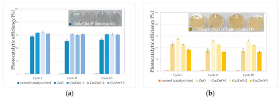 The photocatalytic efficiency of the NPs during three cycles of MB and MO dyes degradation, calculated according to the Equation (3) [57], is presented in Figure 8: