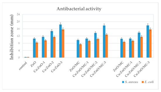 The diameter of the inhibition zone increases from 10 to 18 mm both for Cu:ZnO oxide NPs, Cu:ZnO/MC hybrid NPs and for Cu:ZnO/MC/Textile hybrid coatings, in the case of S. aureus bacteria, and only up to ~16 mm for E. coli, when the doping is 1 at.% Cu. These results indicate a stronger activity on gram-positive S. aureus bacteria.