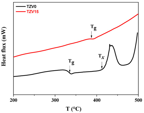 From the DSC curves (Figure 1), the glass transition temperature Tg was estimated to 332 °C and 386 °C for the samples TZV0 and TZV15, respectively, with an accuracy of ±3 °C. The tendency of Tg is to increase with the added amount of V2O5, which contributes to the good thermal stability of the TZV glasses.