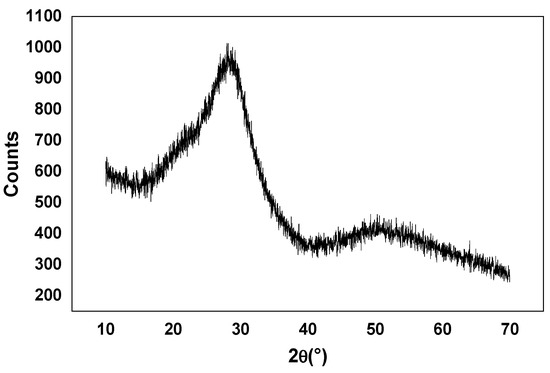 Figure 2 represents a typical XRD pattern relative to the TZV5 glass after thermal treatment at 300 °C. A broad scattering at lower angles was the only observed signature of disordered structure. This evidenced the amorphous nature of the prepared glasses.