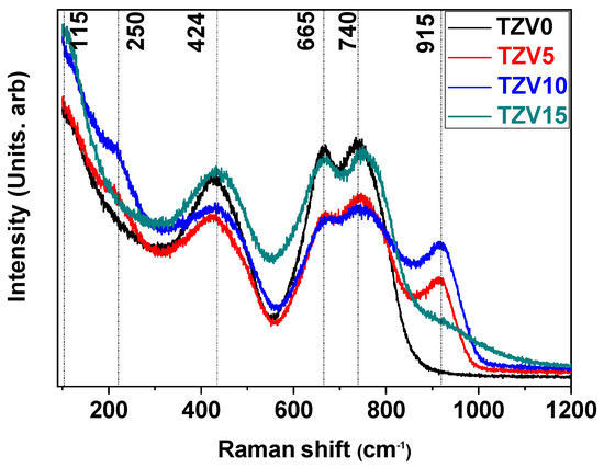 The Raman spectra of the glasses are illustrated in Figure 3. The band appearing at low frequencies (around 115 cm−1) is relative to the Boson vibration. This latest development is defined as the collective motions of atoms’ acoustic phonons within the medium-range of glasses that characterize the disorder and the amorphous structures [6]. The Raman band at 210 cm−1 corresponds to the vibrations of trigonal pyramidal (tp) TeO3 groups overlapped with bands originated by V-O-V and/or V-O-Te vibrations [11]. On the other hand, the band at 424 cm−1 is ascribed to both the bending and stretching vibrations of Te-O in Te-O-Te or O-Te-O linkages, where oxygen is alternatively in an axial or equatorial position [5]. The large Raman band at 665 cm−1 is relative to Te-O stretching vibration in the (TeO4) tbp units [5,12]. Brovelli et al. [13] suggested that this band is relative to the crystalline phase α-TeO2. The shoulder appearing at about 740 cm−1 is reported to be due to the presence of non-bridging oxygen (NBO) in some tellurium structural units [5,14]. The band situated around 915 cm−1 is ascribed to the V-O stretching vibration in (VO4) units [15]. As the V2O5 content increases from 0 to 15 mol %, the Raman bands slightly shifted to a higher frequency, while their intensities decreased owing to the generation of NBOs at both the equatorial and axial positions, which leads to the formation of new bonds of Te-eqO-V+, Te-axO-V+, and also Te=O.