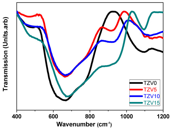 The FTIR spectrum of the TZV0 sample showed principally three peaks located at 470, 670, and 920 cm−1 (see Figure 4). The band located at around 470 cm−1 is assigned to the bending vibrations of Te-O-Te or O-Te-O linkages [5]. The broader band positioned between 600 and 750 cm−1 is an overlapping of two bands: the first, centered at 670 cm−1, is related to the stretching vibration of equatorial and axial Te-O bonds in the (TeO4) trigonal bi-pyramid units (bridging oxygen (BO)) [11]. The second band that appears above 700 cm−1 is ascribed to the Te-O vibration in (TeO3) trigonal pyramid units (tp) with non-bridging oxygen (NBO) [5]. At a lower amount of V2O5, the vanadate ions enter the glass network by breaking up the Te-O-Te, bonds resulting in dangling bonds (Te-O-V) that decrease TeO3 units by forming (TeO4) ones [14]. The variation of the intensity depends highly on the increase of the number of TeO3/TeO3+1 units at the expense of the number of (TeO4) units. The appearance of a new band centered at around 920 cm−1 is related to the stretching vibrations of V=O linkages in the pentahedral (VO5) units [15].